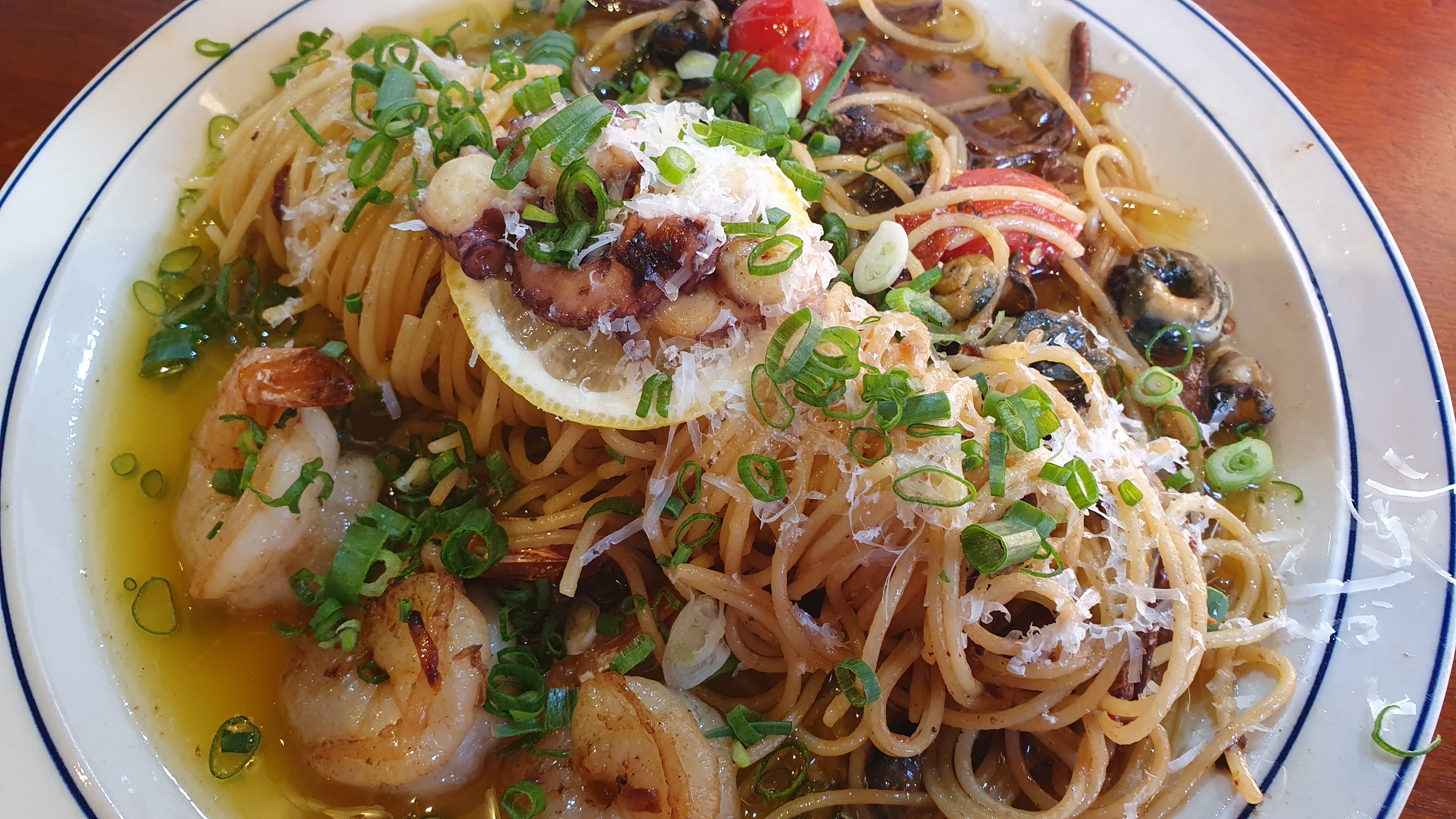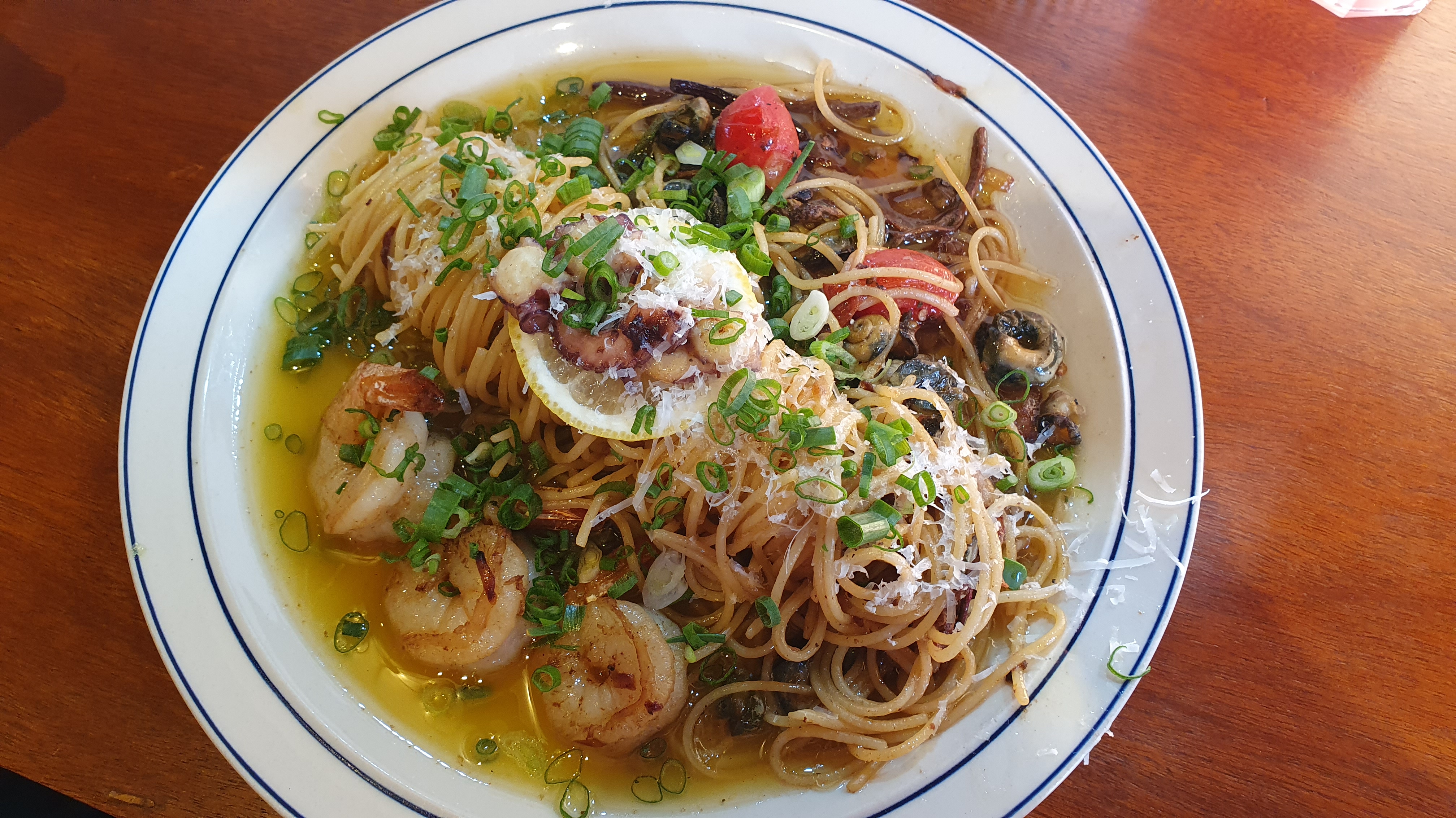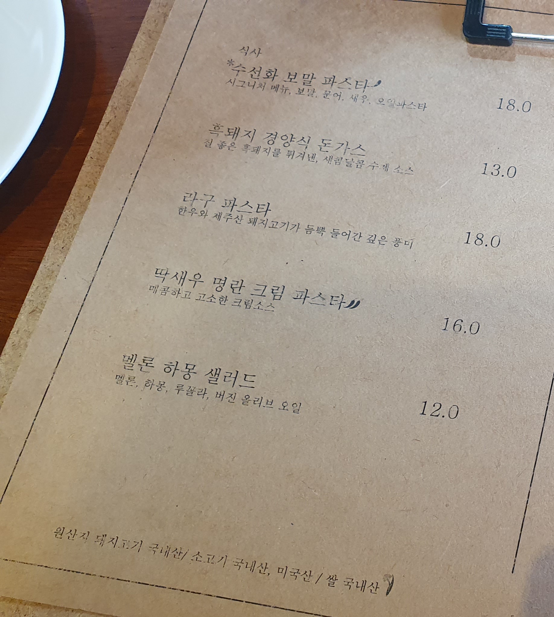 우리가 시킨 건 수선화 보말 파스타, 흑돼지 경양식 돈가스였다.