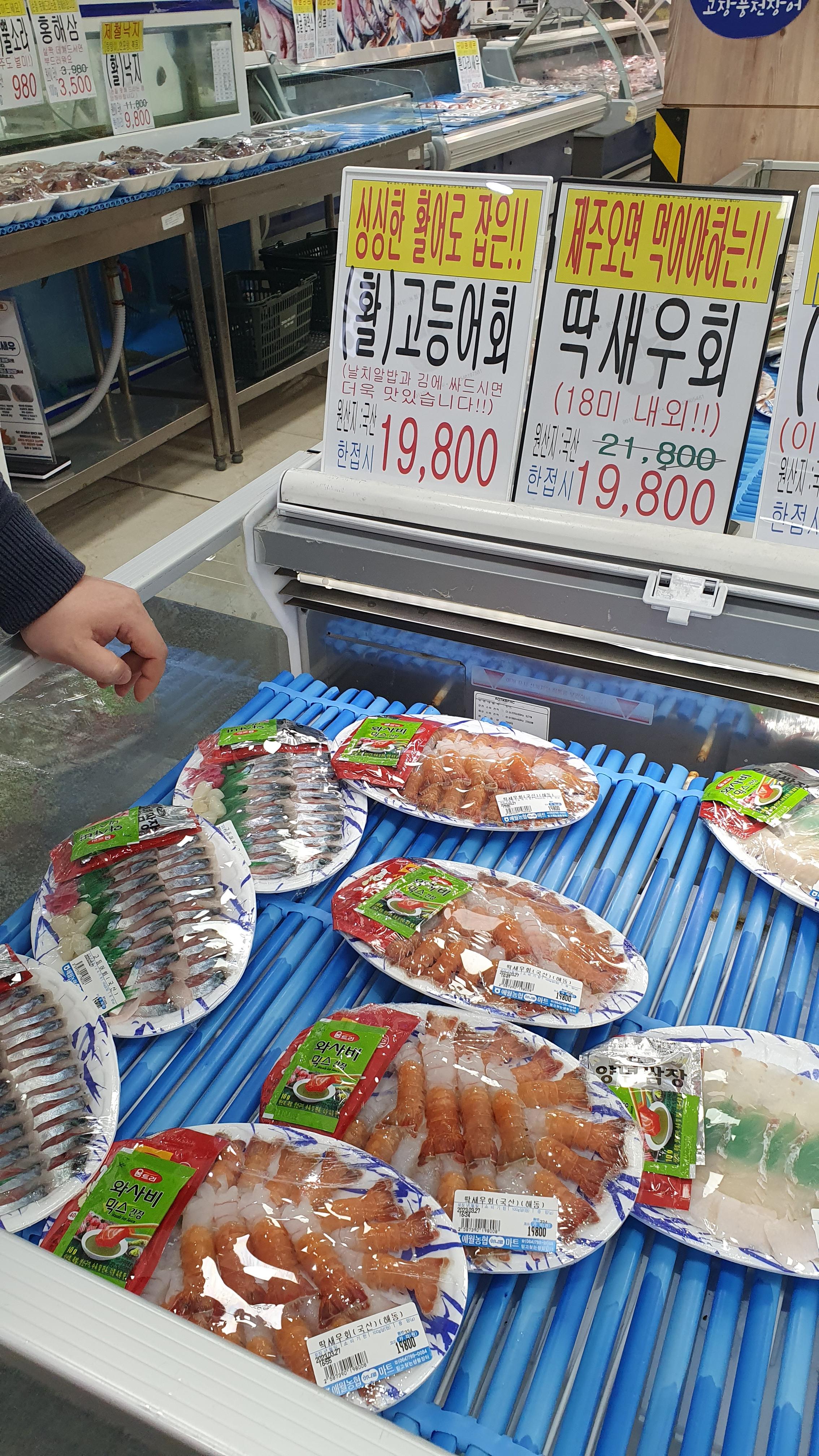 제주 농협에는 딱새우, 고등어, 광어, 도다리, 연어 등 회를 판다고 해서 야참으로 먹을 겸 가봤다.